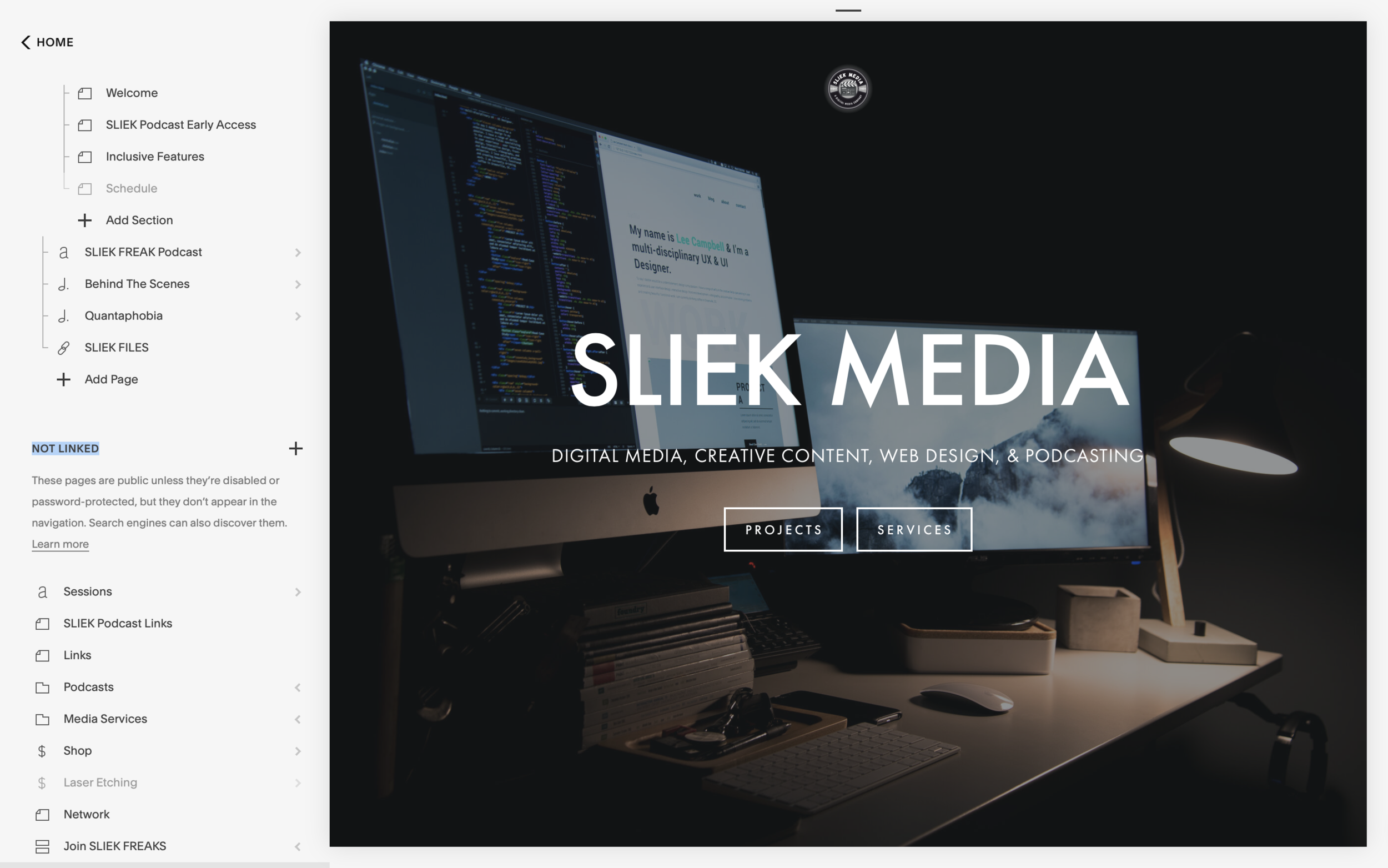 In Squarespace you simply follow the sidebar under the pages navigation to the bottom where you will see and option to add an “Unlinked Page.” This is useful for designing and testing new pages for your website without adding it to your website’s navigation menu. This means that visitors on your website won’t be able to access the page through any listed menus. They would need the direct URL of the page.